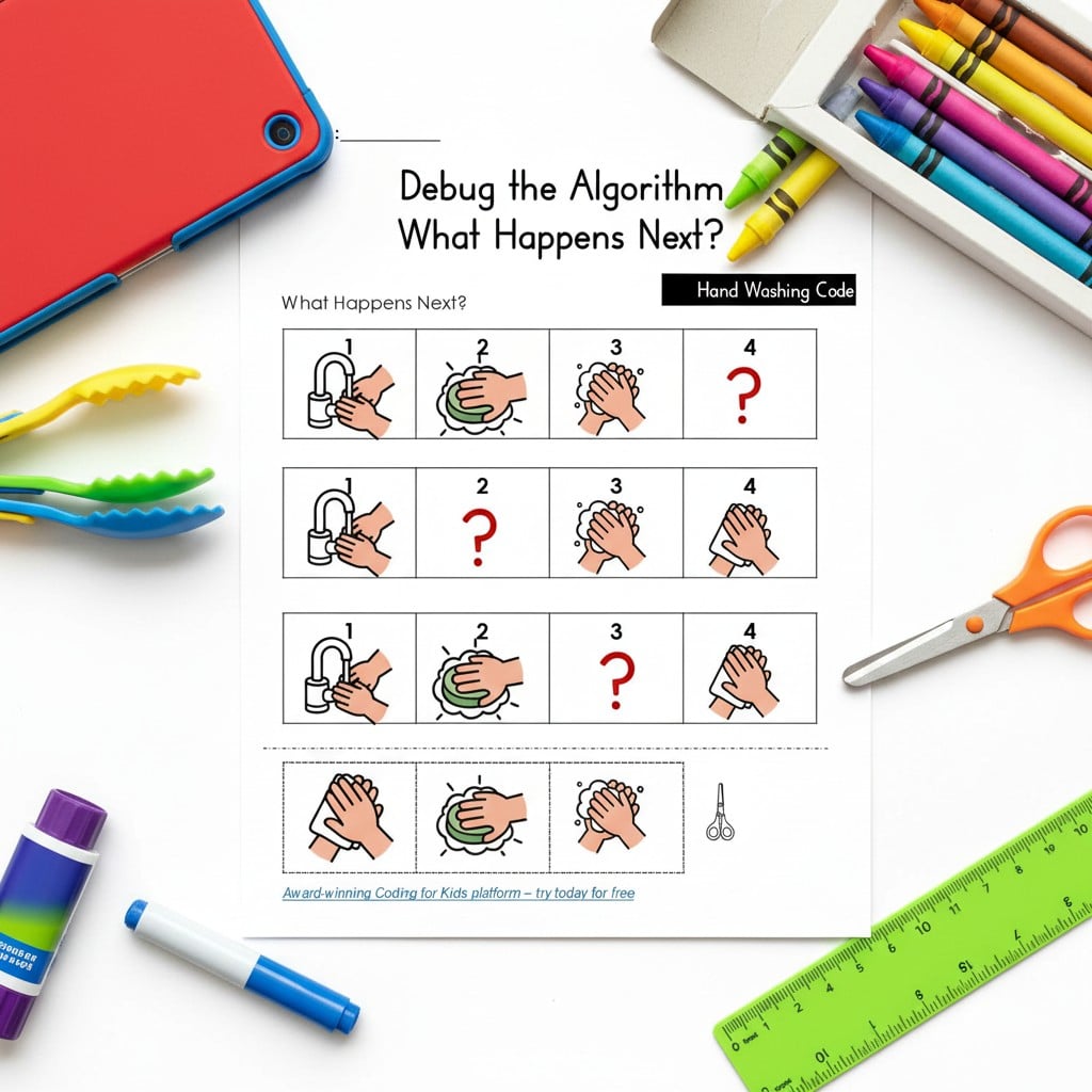 These coding worksheets for elementary students focus on everyday routines like planting a seed and washing hands, turning them into simple algorithms.