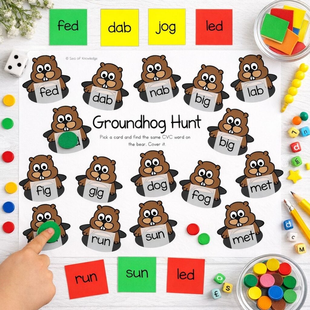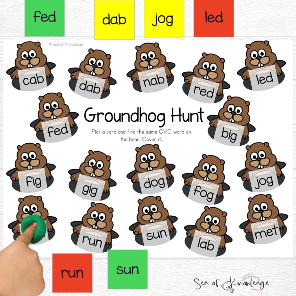 Just print the mats and the matching words, have the kids read the words on the cards and find the matching CVC word on the mat. They will then add it to cover the ‘groundhog’.