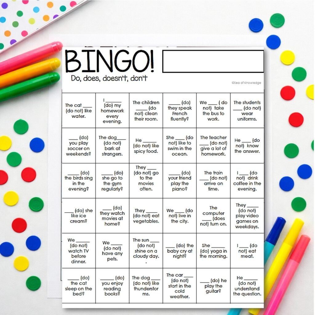Grammar practice does not have to mean worksheets and groans. This FREE Do, Does, Doesn’t, Don’t Grammar Bingo turns sentence practice into an actual game my students beg to play again. Each square includes a real sentence where students have to think about the correct verb choice before covering it.