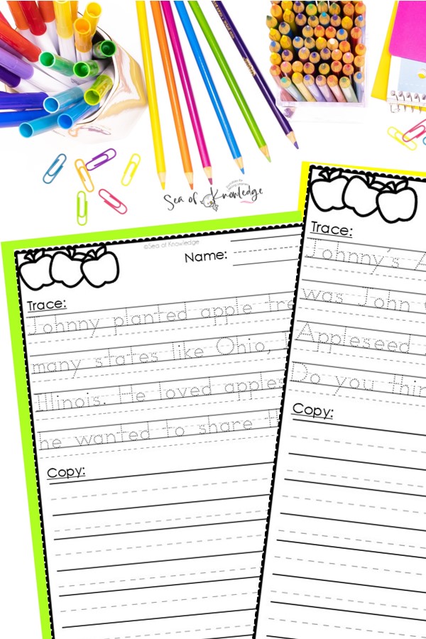 Pick it up here: Johnny Appleseed Facts Handwriting Set.