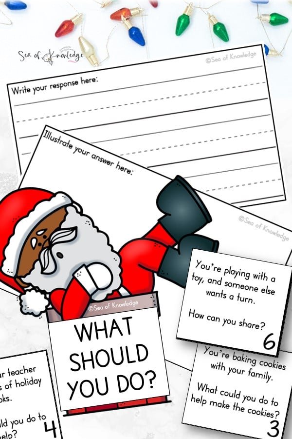 The set comes with a fun, engaging graphic organizer for group work—kids can place a scenario card on Santa’s “predicament” page, brainstorm together, and discuss how they’d handle each scenario.
