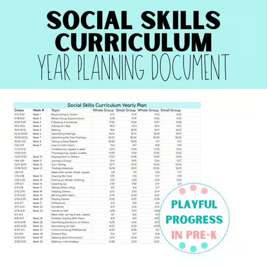 From the author “This is an Editable Google Sheets file that outlines the weeks, lessons, and daily schedule for teaching the Preschool/Pre-K through 1st Social Skills Curriculum (30 weeks). A copy of this file will be made in your Google Drive for you to add in your own schedule of breaks, days off, ect. You can also change the order of the units if you would like!”